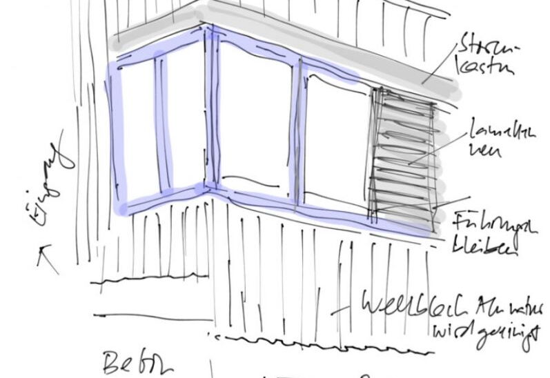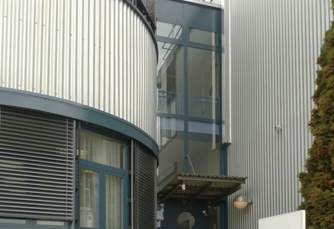 Das Gewerbehaus mit einer klaren 80er-Jahre-Architektur benötigte eine Renovation. Die natur eloxierten Aluminium-Wellbleche waren in einem sehr guten Zustand und mussten nur gereinigt werden. An den pulverbeschichteten Fensterrahmen hingegen war die Farbe sehr ausgebleicht, der Anstrich musste dringend überarbeitet werden. Zum Einsatz kam ein aus den industriellen Pigmenten Pariserblau und Eisenoxidschwarz entwickelter eleganter Blauton. Um die horizontalen Bänder zu betonen, wurden auch die Blenden in diesem Farbton gestrichen.